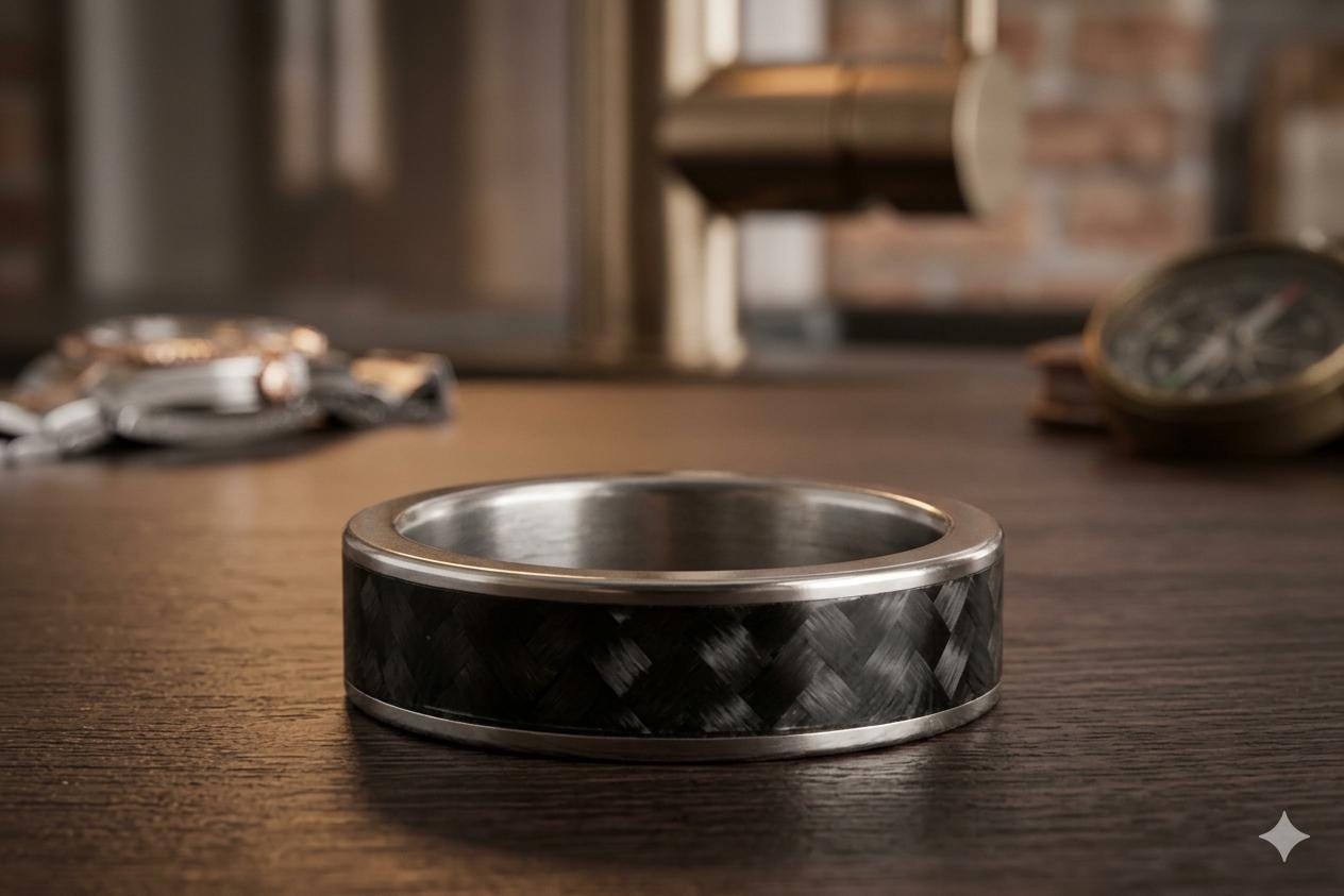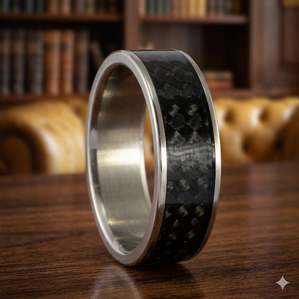 Polished titanium ring with a central band of glossy carbon fiber woven at 45º.