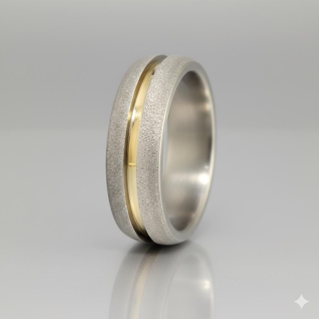 Sandblasted Titanium Ring with 18K Yellow Gold Inlay - Handmade Wedding Band. (01558_7N)