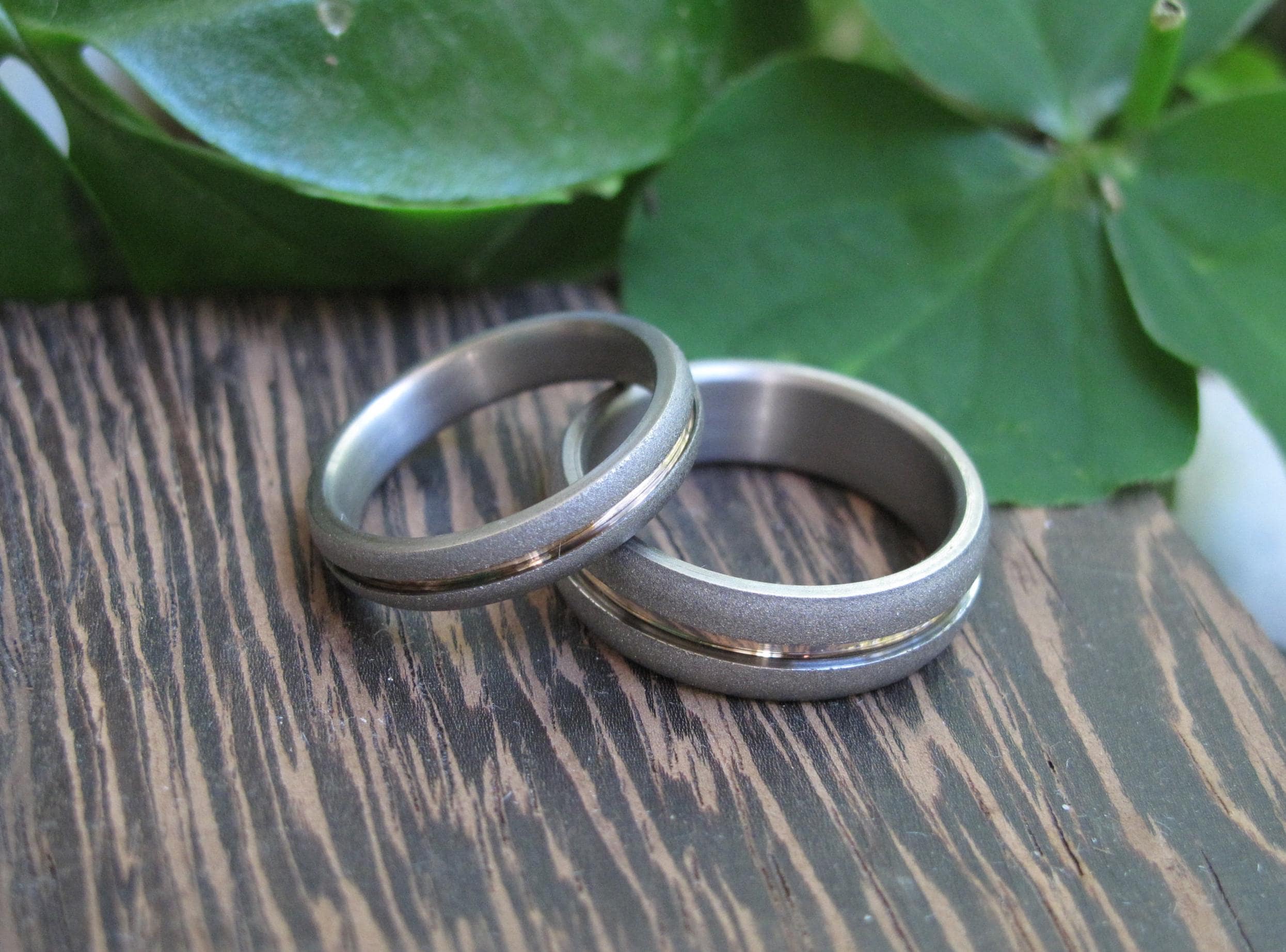 Sandblasted titanium wedding rings with yellow gold 18K inlay.