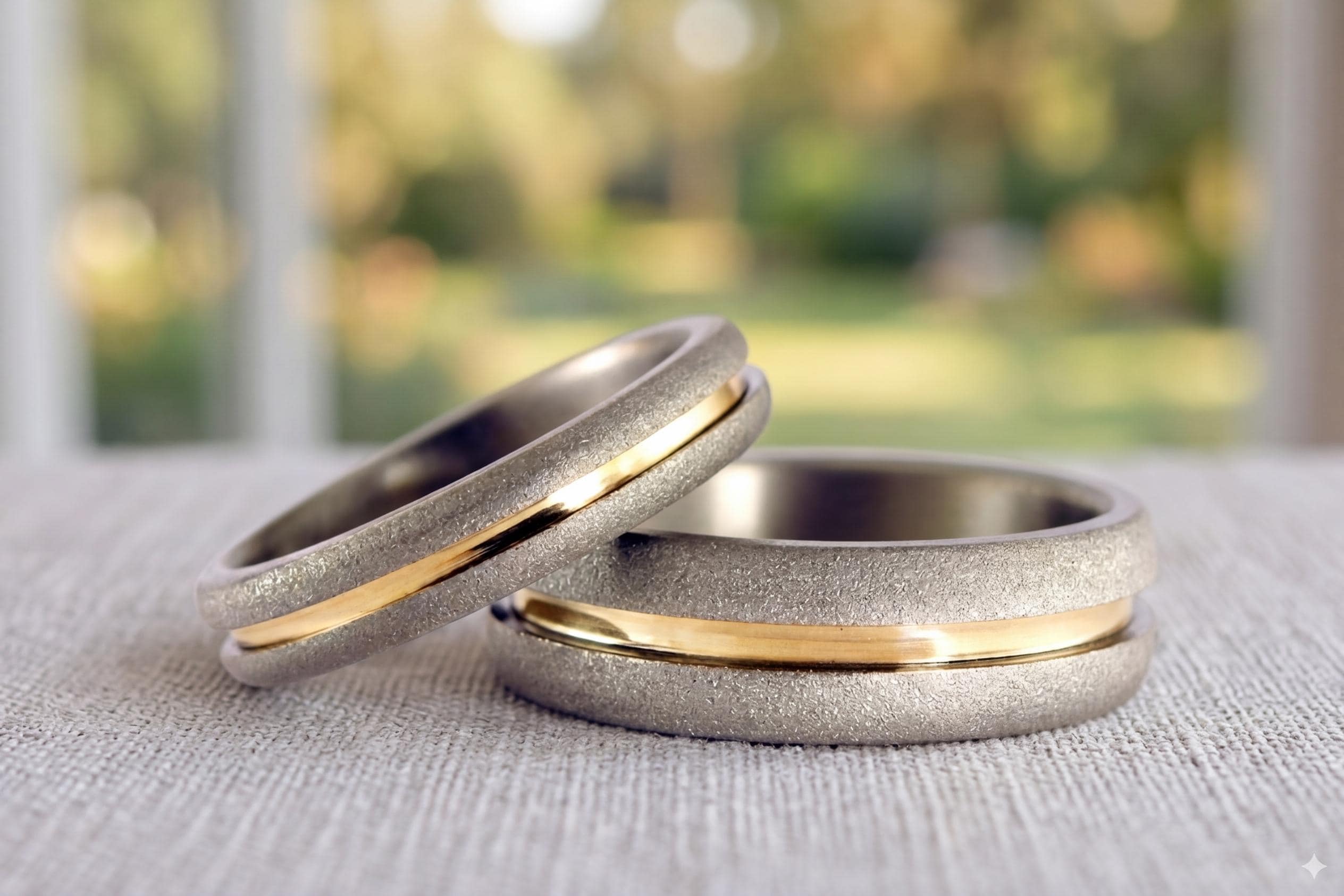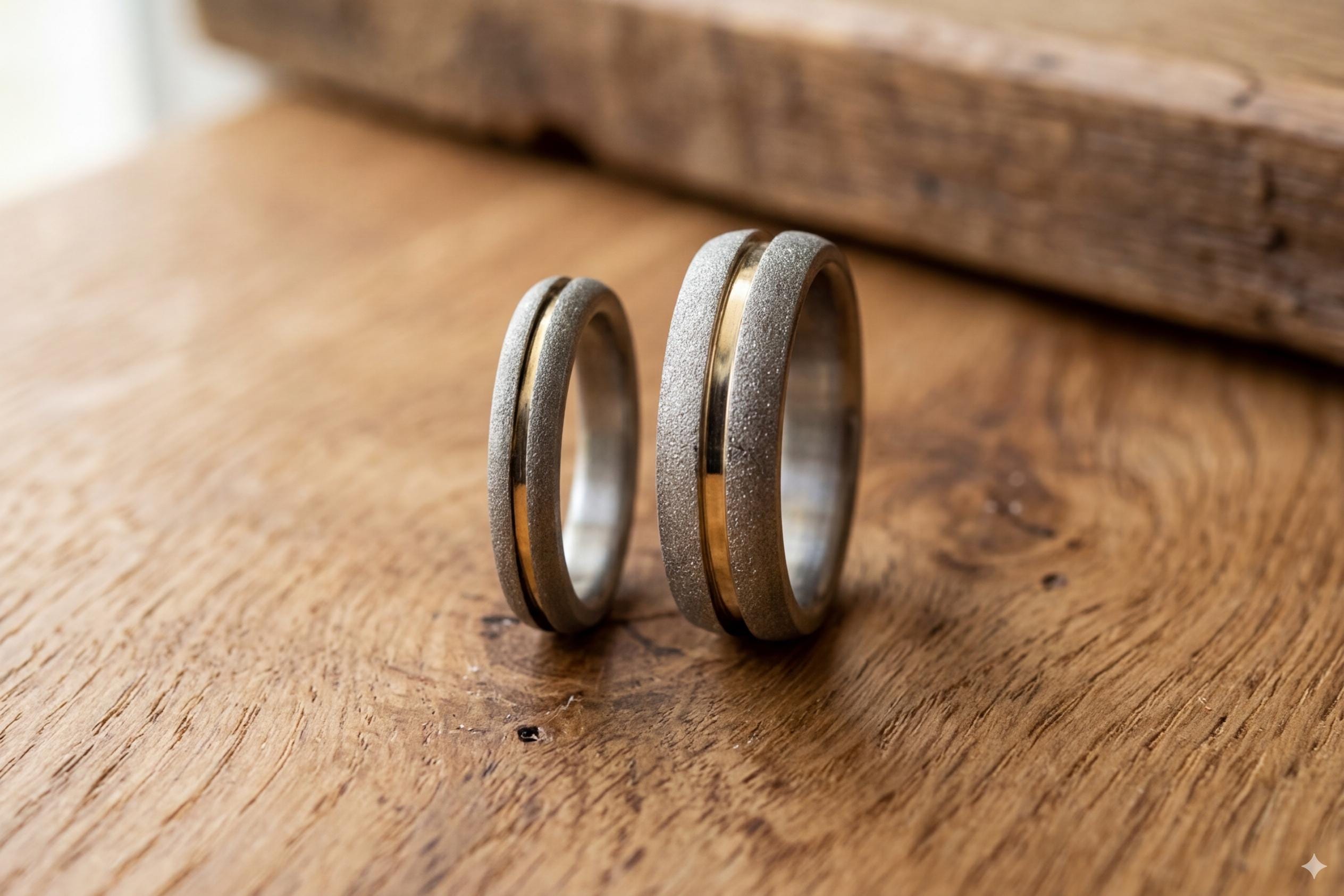 Sandblasted titanium wedding rings with yellow gold 18K inlay.