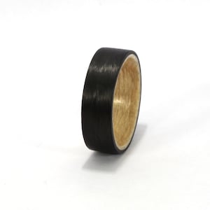 To make this beautiful ring we used: Carbon Fiber: Similar properties to steel but lightweight like wood or even plastic. Higher resistance to impact than steel. Wood: We use hardwoods only. All of them are specially treated to make them more resistant to sunlight, water and not to lose their shine.