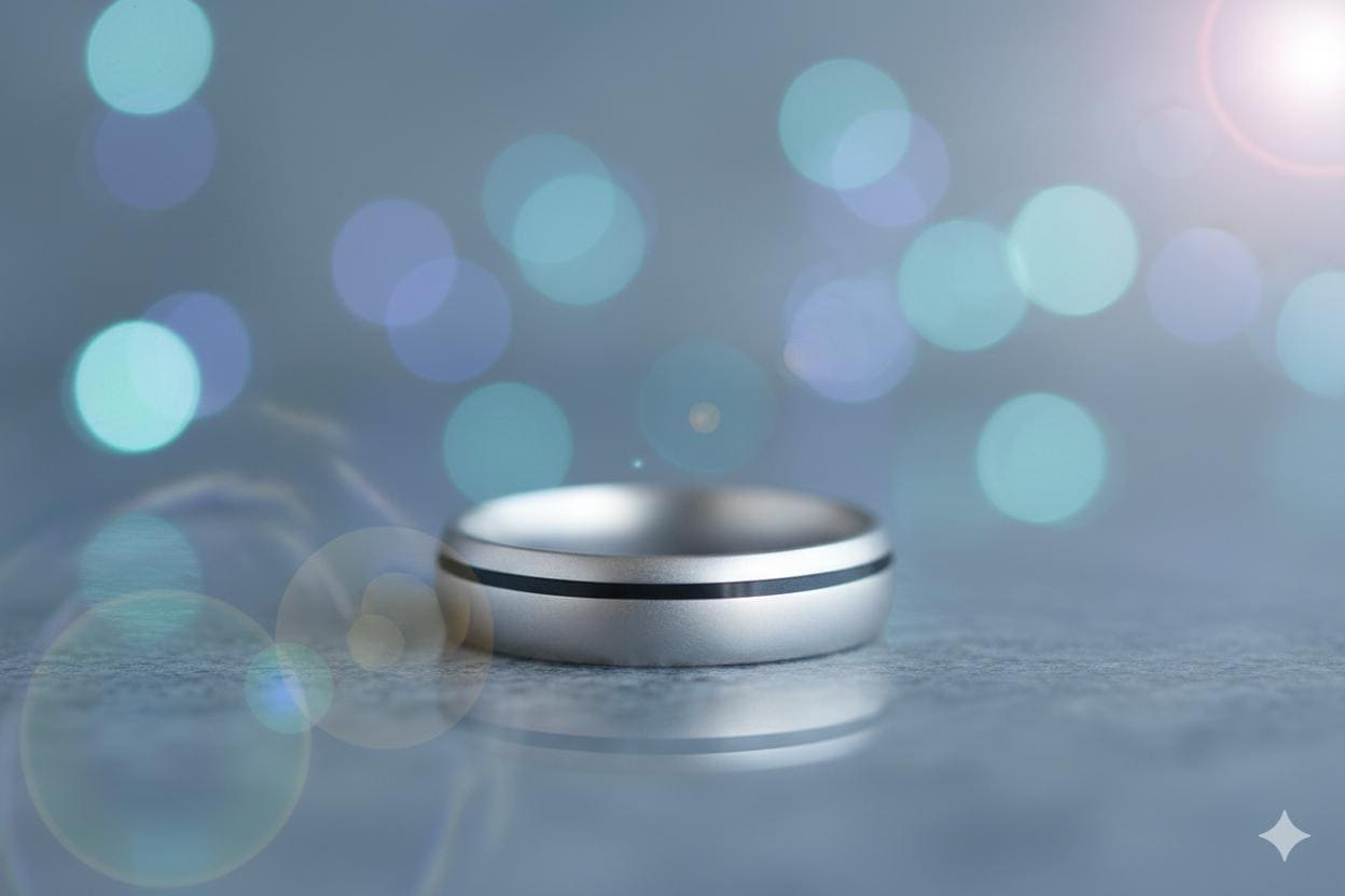 Matte titanium ring with a carbon fiber line off centered.