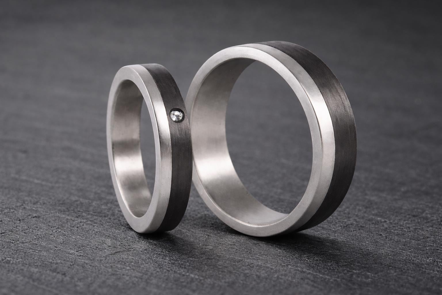 Titanium wedding rings with lateral carbon fiber band and a Swarovski crystal on the woman's ring.