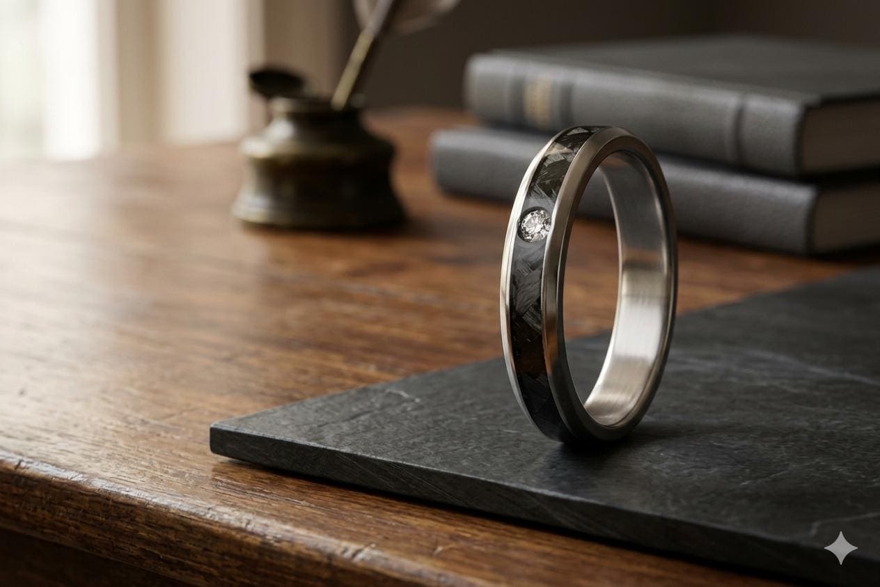 Polished titanium ring with a central band of carbon fiber woven at 45º and a Swarovski crystal.
