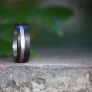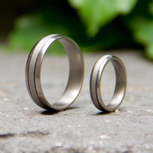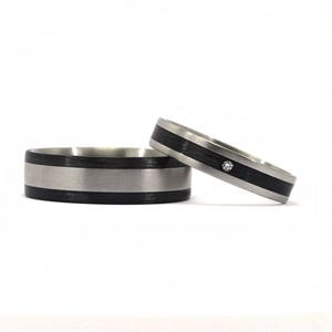Polished titanium wedding rings with a central band of carbon fiber woven at 45º.