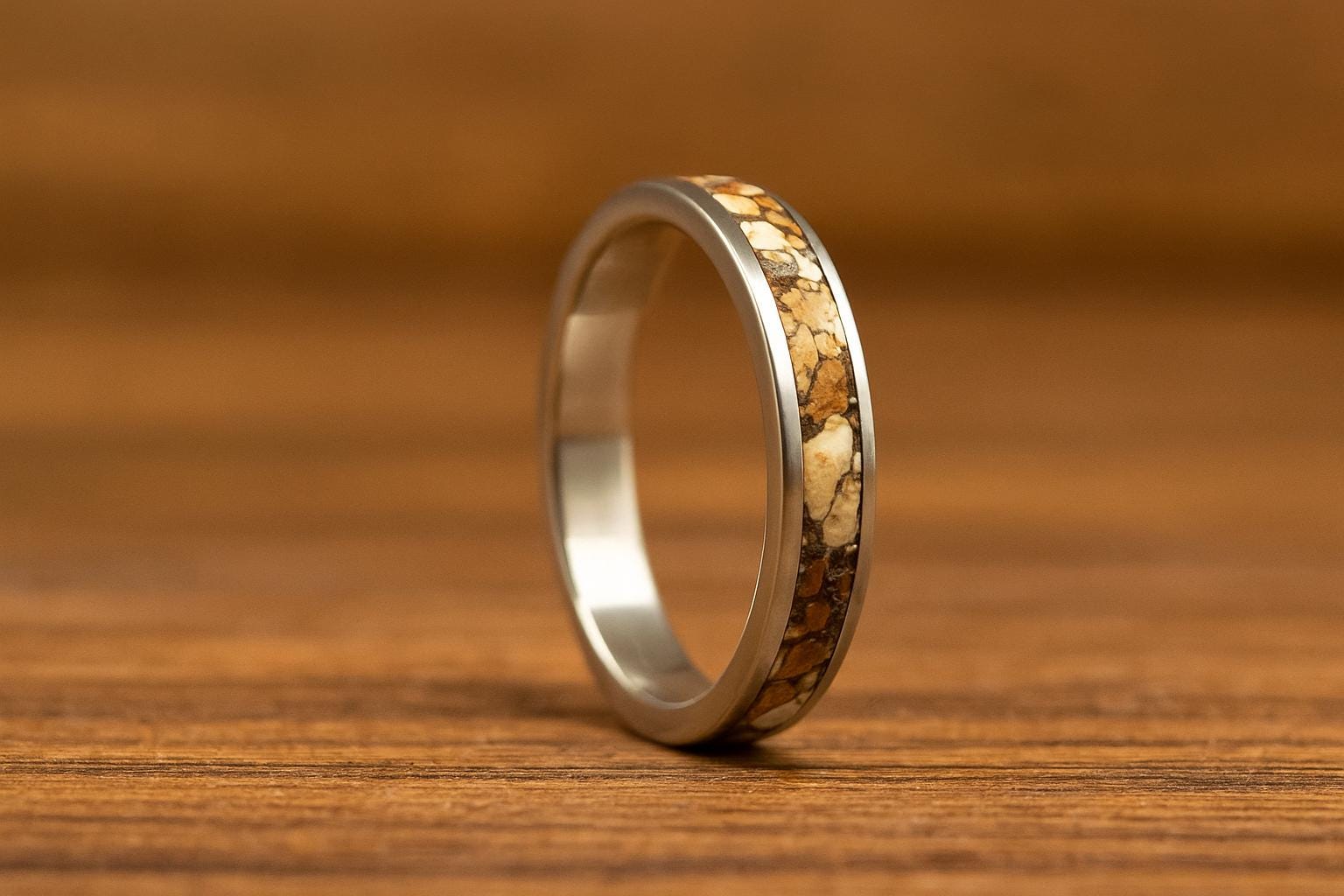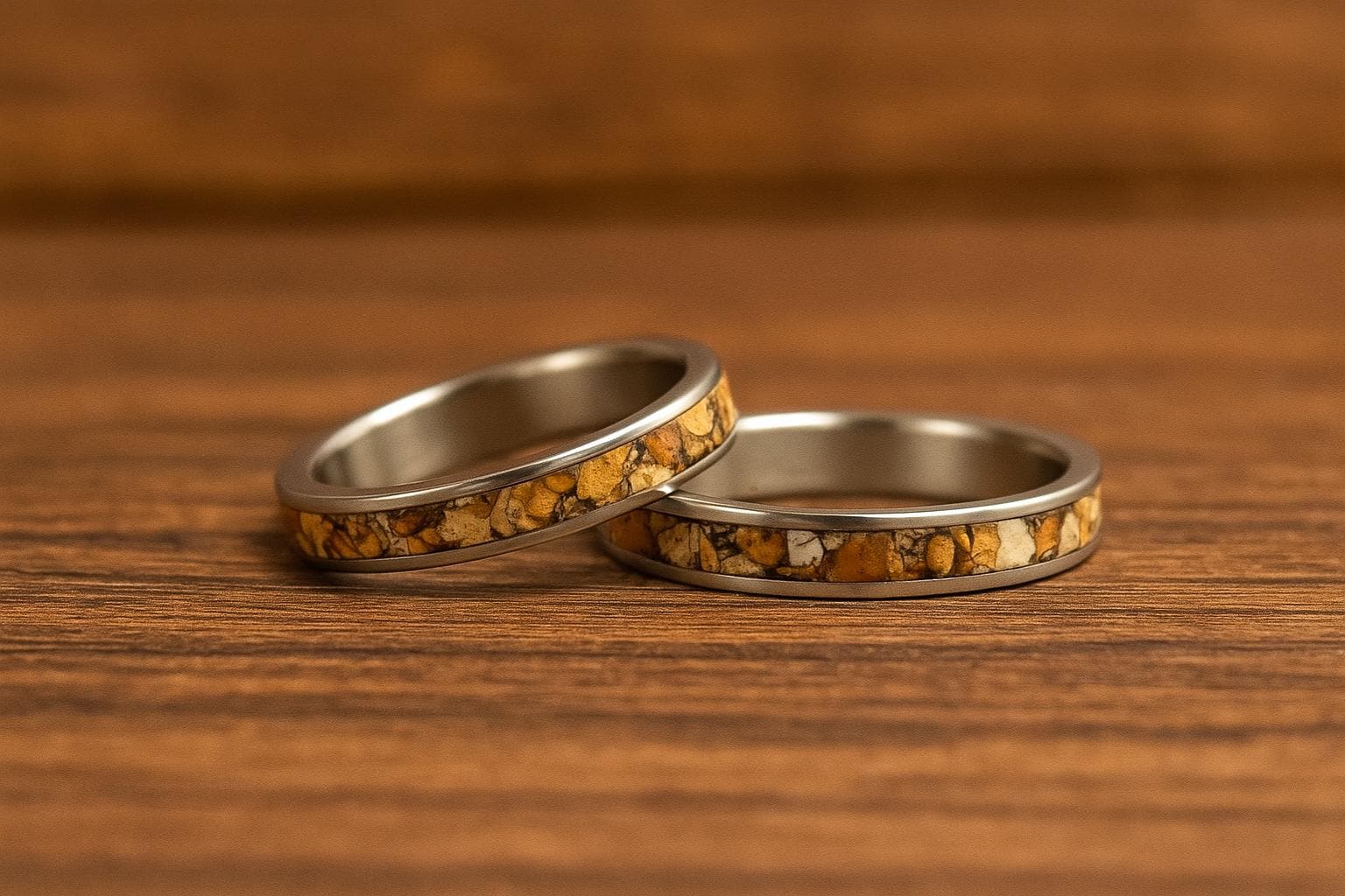 Titanium wedding bands with central band of brown jasper semi precious stone and polished edges.