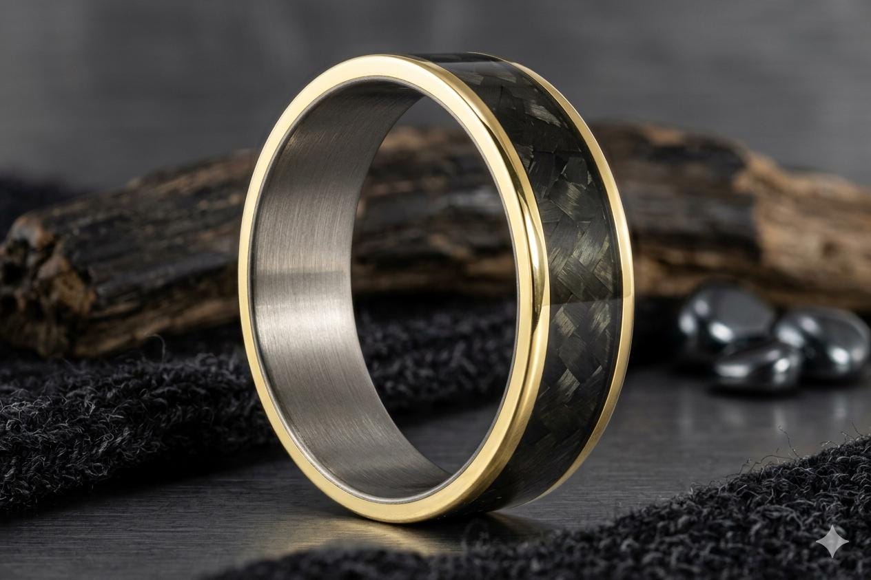 Titanium and glossy carbon fiber band woven at 45 degrees ring with yellow gold lateral edges.