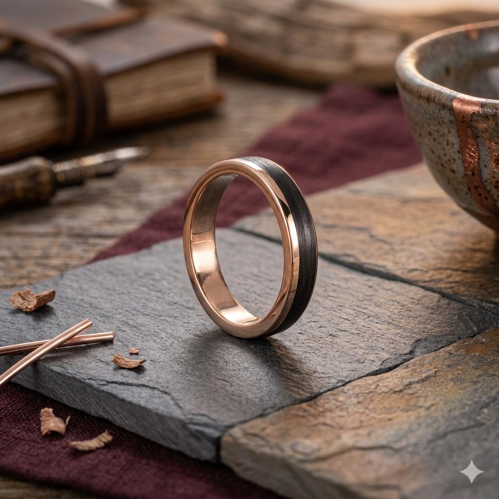 Unique ring made in 18k rose gold with a carbon fiber lateral band giving a harmonious and balanced structure.