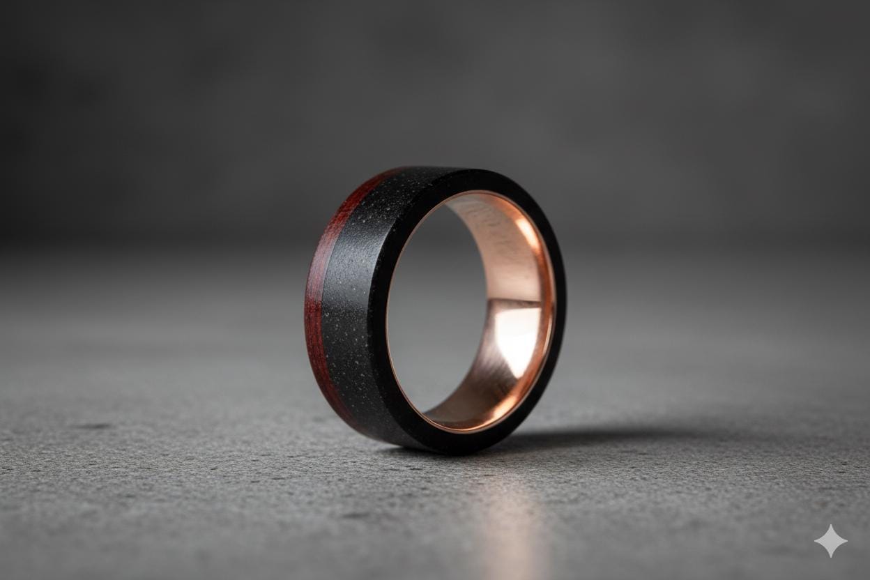 Rose gold ring with black concrete and wenge wood.
