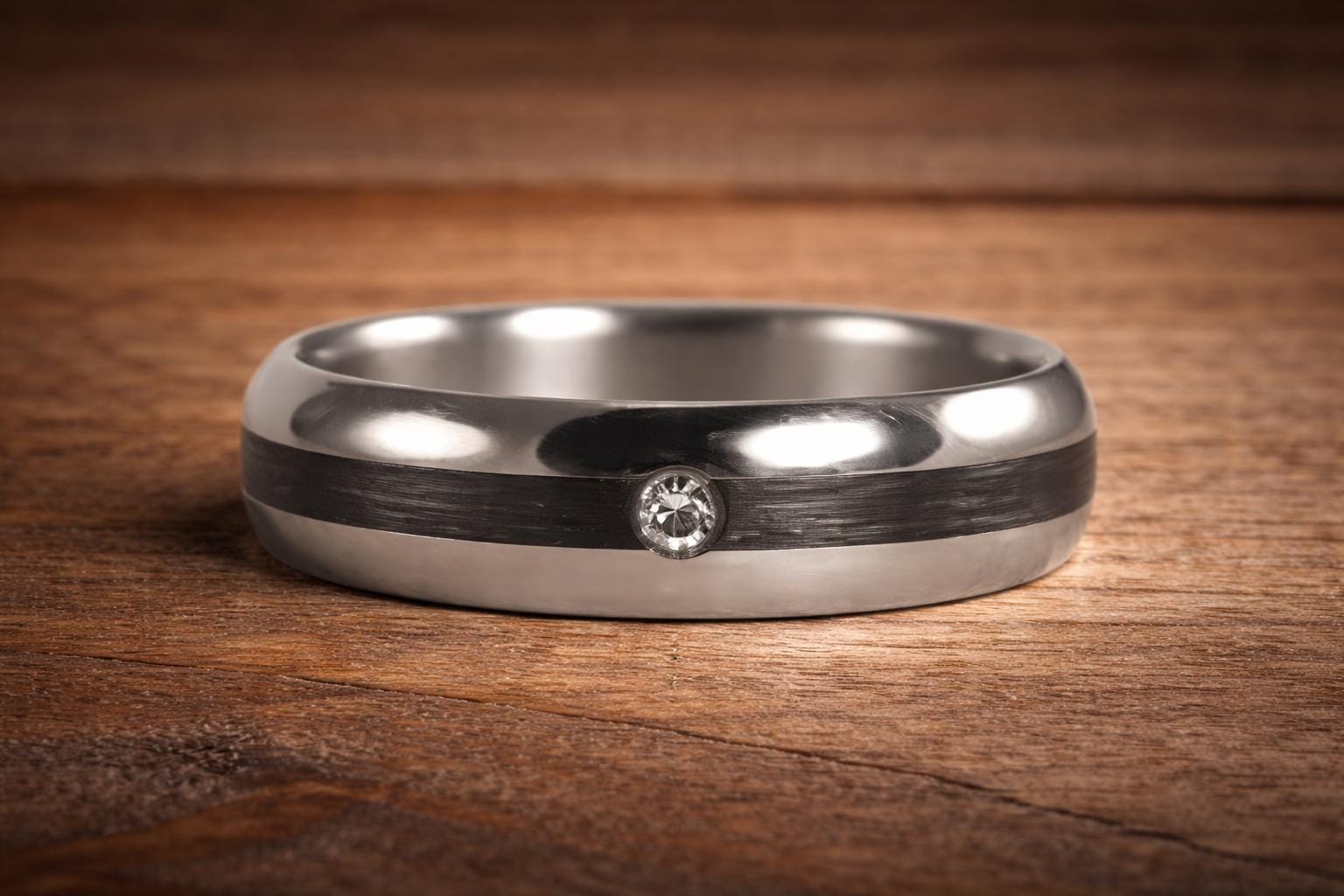 Polished titanium ring with a centered carbon fiber band and a Swarovski crystal.