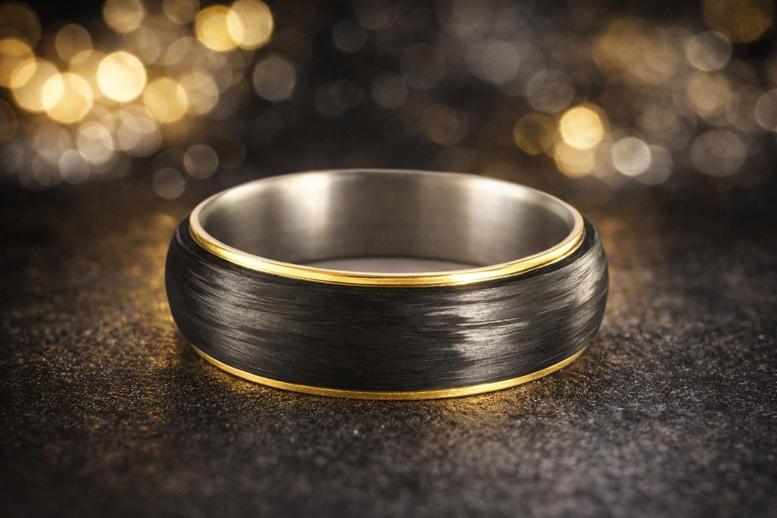 Titanium ring with central band of carbon fiber and gold 18K stripes on both sides.