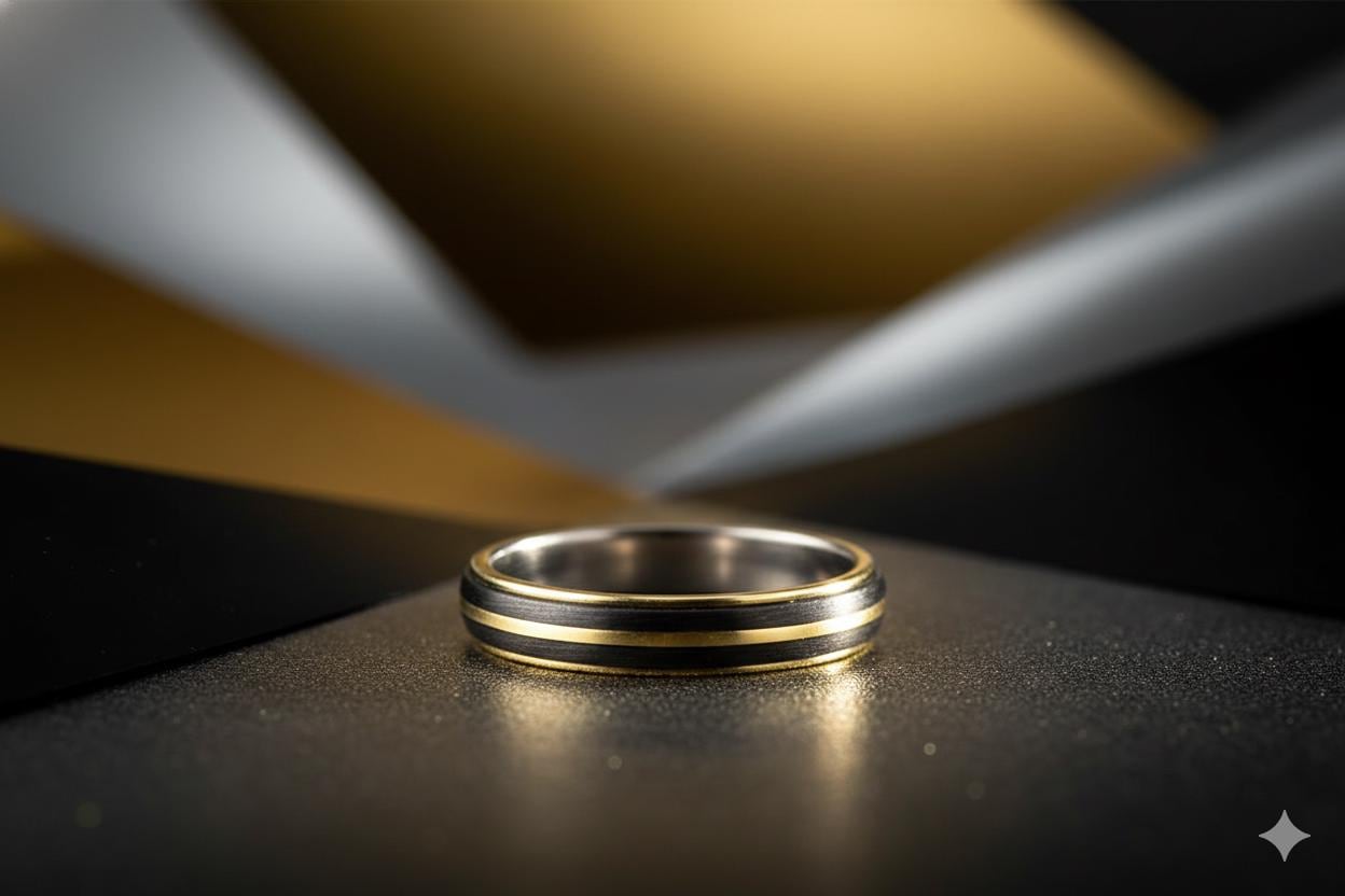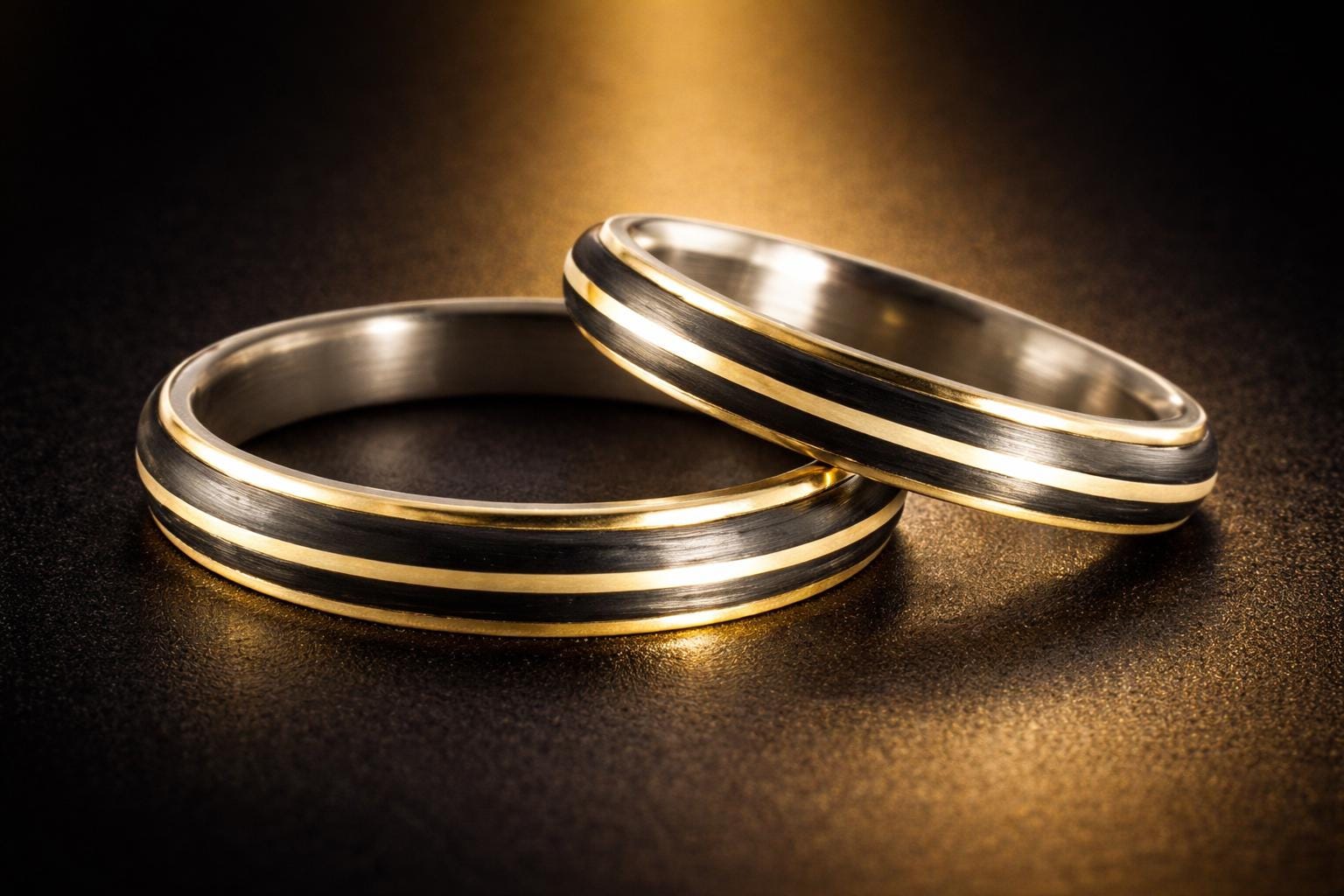 Titanium wedding rings with central band of carbon fiber and gold 18K stripes.