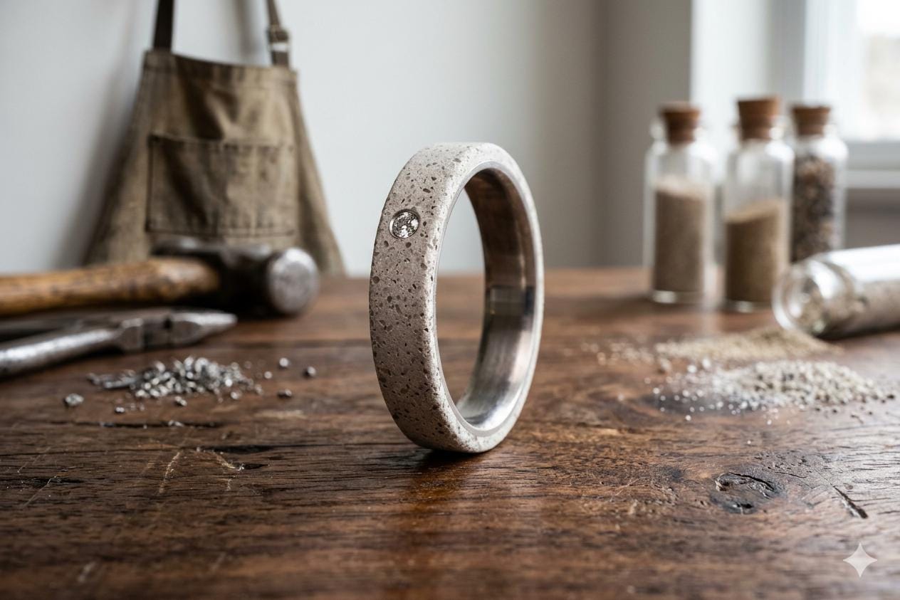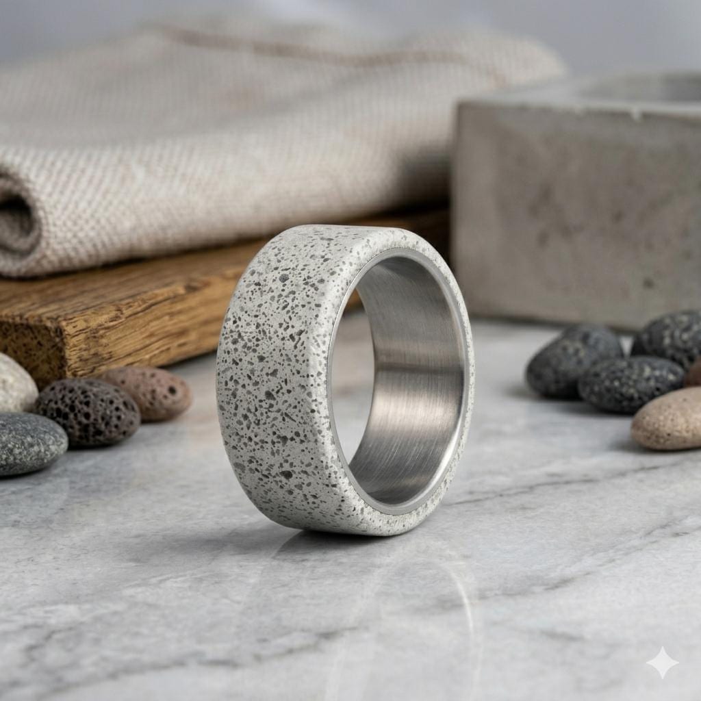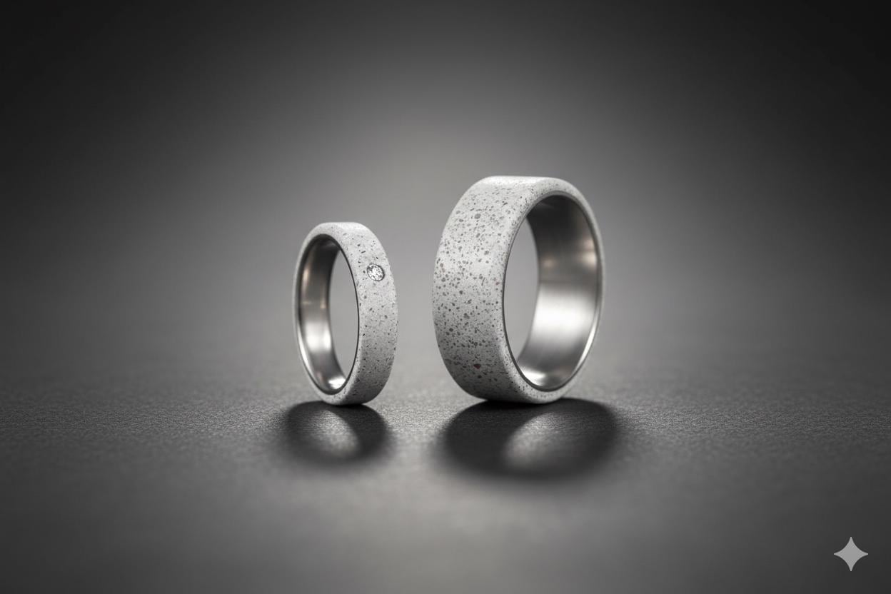 Titanium and matte gray concrete wedding rings with Swarovski crystal on the woman's ring.