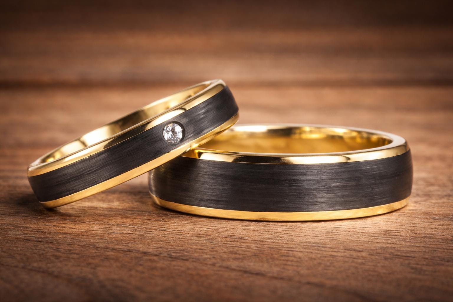 Yellow gold ring with matte carbon fiber band in the center. The woman's ring has a Swarovski crystal.