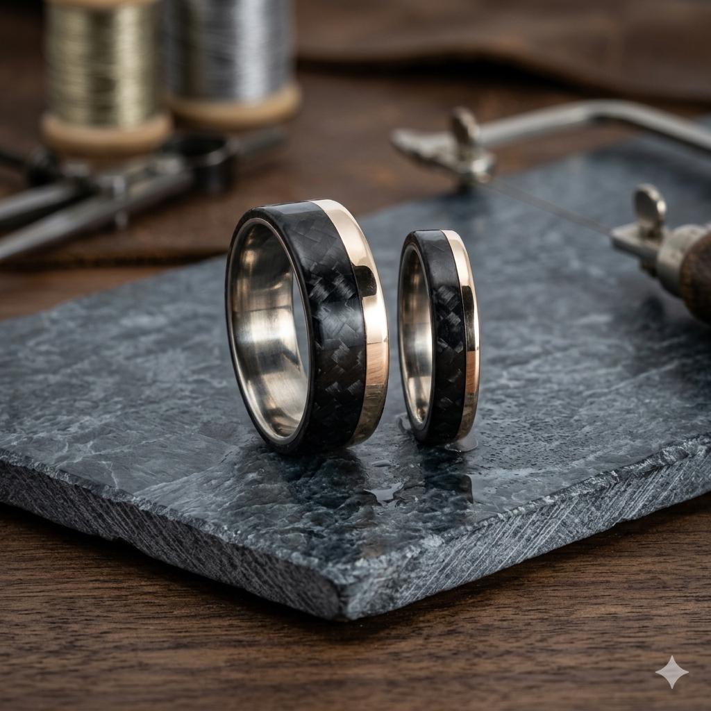 Titanium and 18k yellow gold wedding rings set with twill carbon fiber. Black and gold flat matching wedding bands